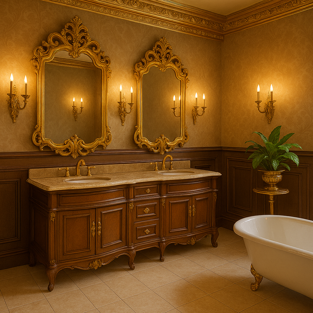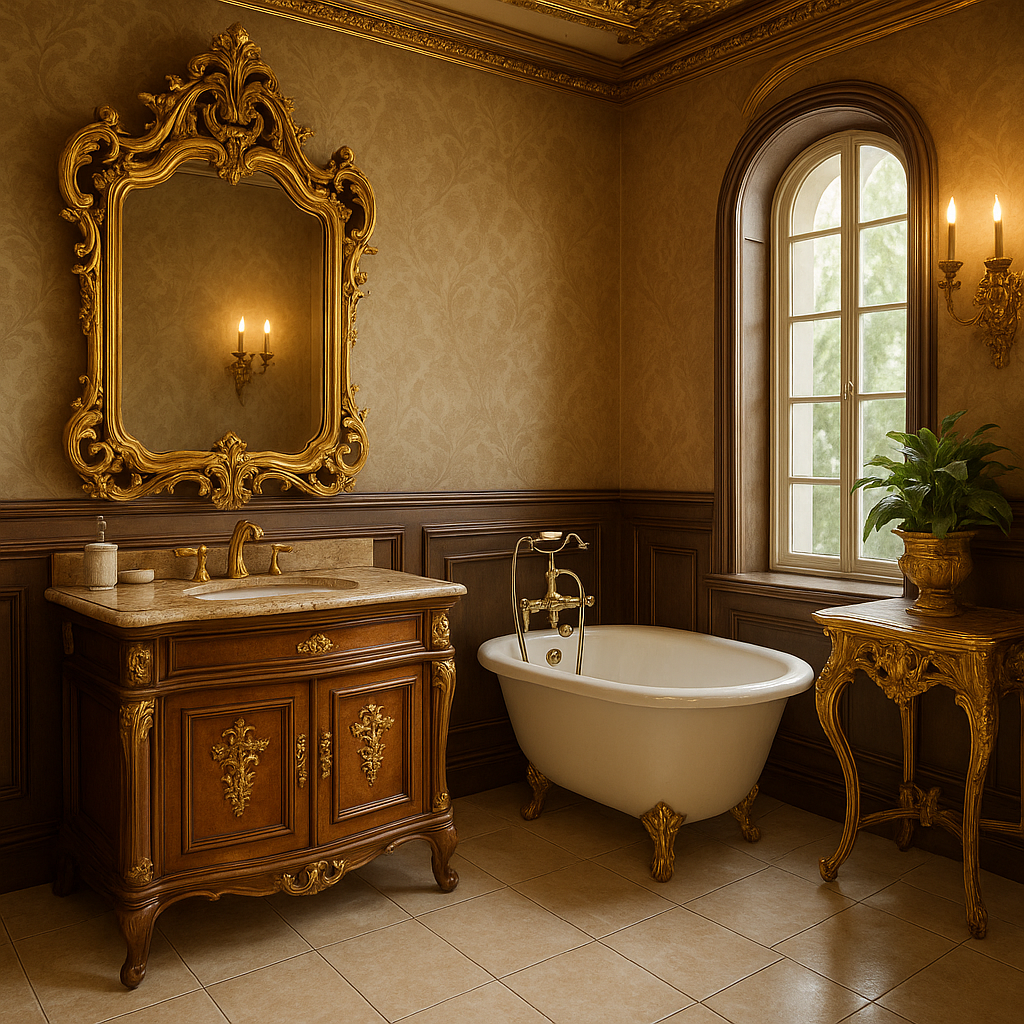 Il cuore di un bagno barocco è rappresentato dai mobili ornamentali. I mobili lavabo sono spesso realizzati in legno massello con finiture dorate o argentate, intagli elaborati, piedini ricurvi e superfici laccate o marmoree. Specchi con cornici scolpite in foglia oro o argento completano l'effetto scenografico.