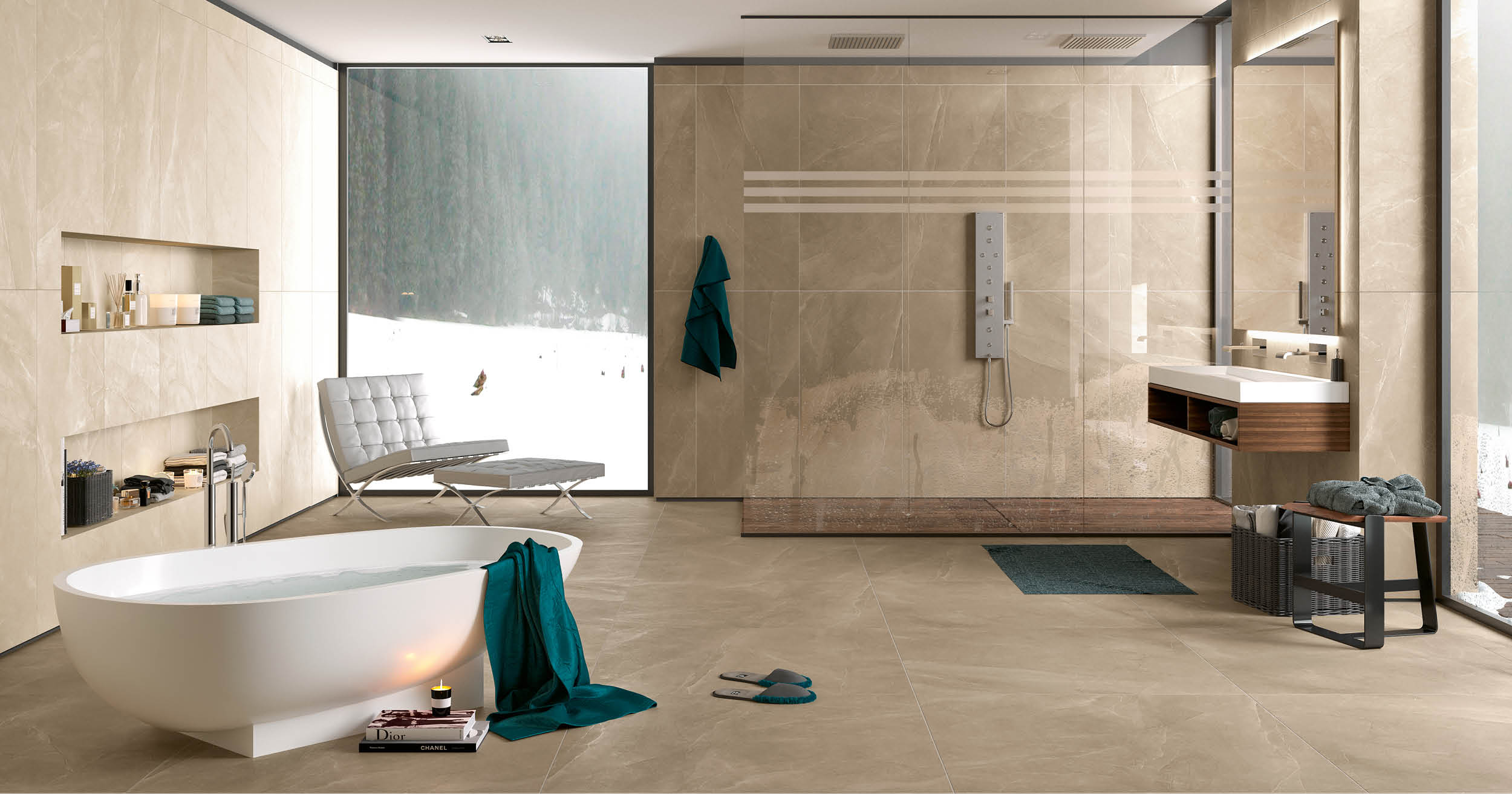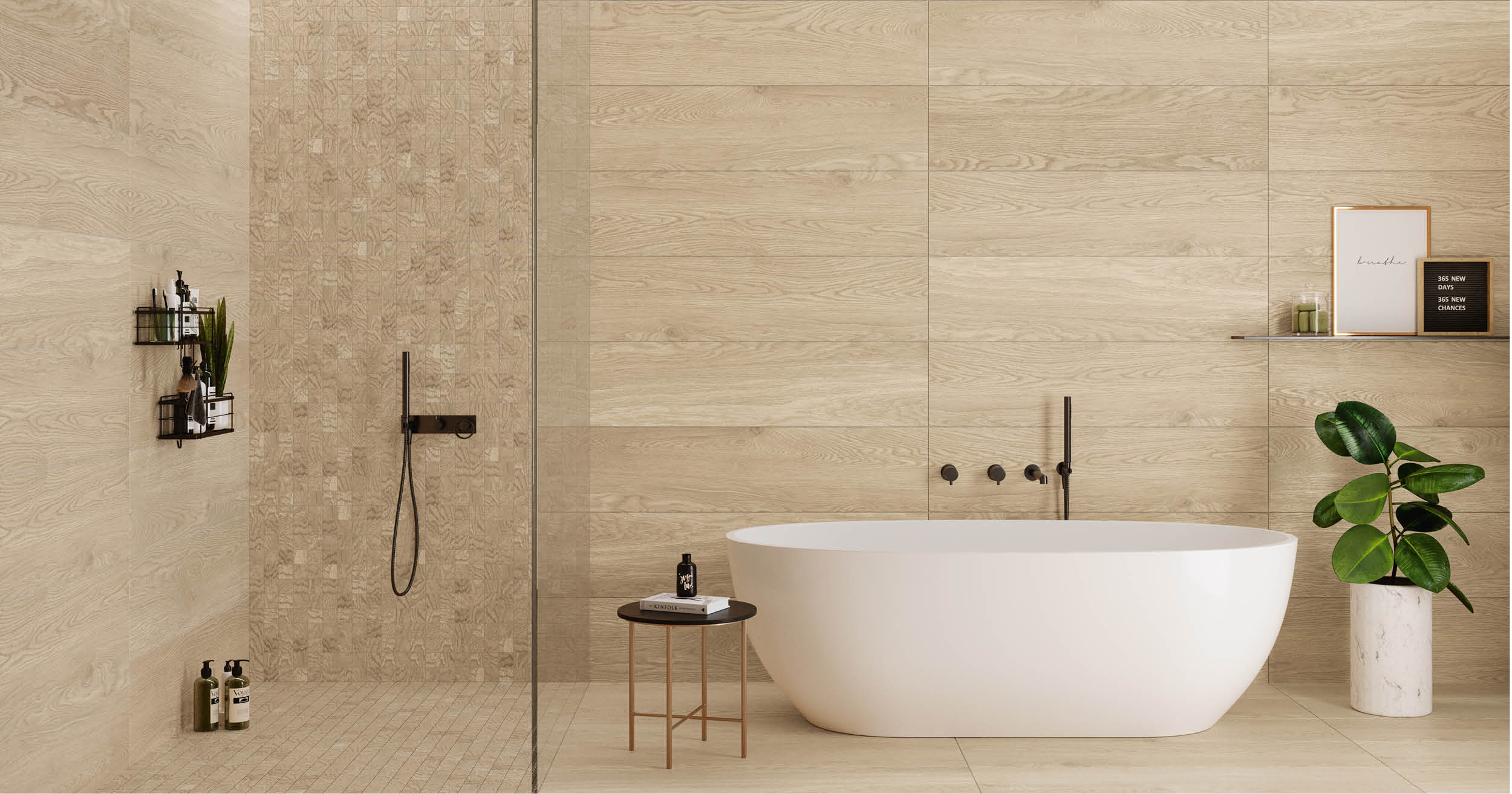 Optiamo per piastrelle con texture e colori che ricordano questo materiale per contribuire a creare un aspetto rustico e autentico nell’ambiente bagno.