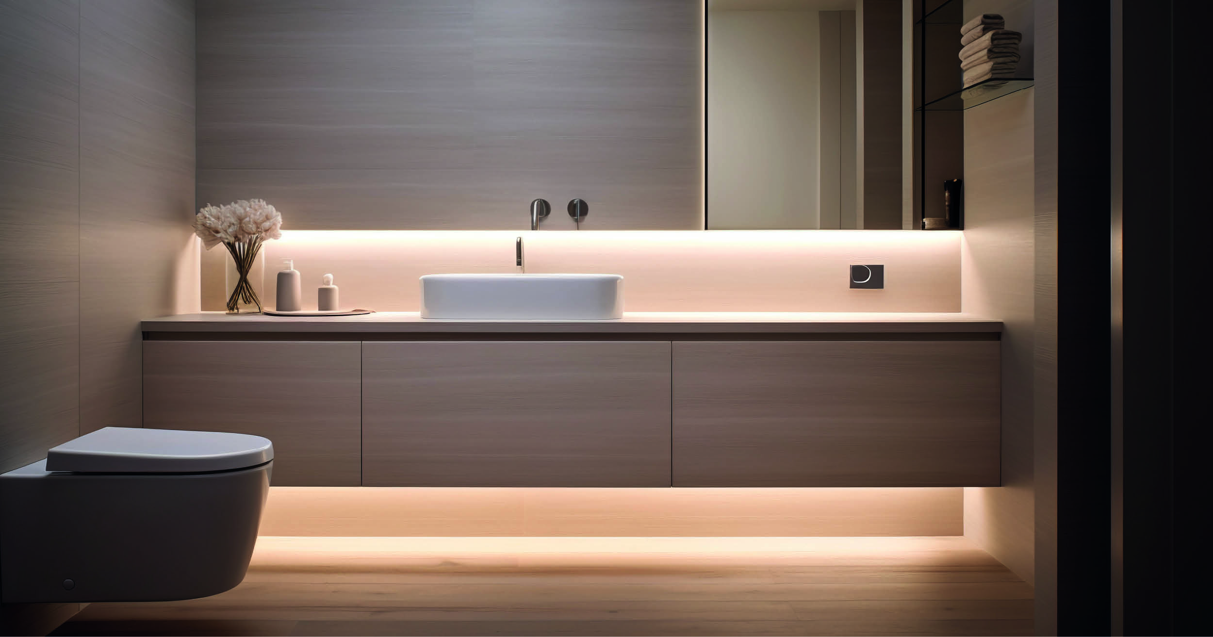 Illuminazione stratificata: non solo luce funzionale. Utilizzate una combinazione di luci soffuse, come strisce led nascoste o applique a luce calda, per creare un'atmosfera rilassante e avvolgente, simile a una spa.